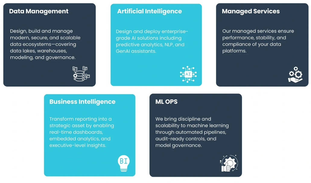 We empowers organizations to unlock the full value of their data through secure, scalable, and intelligent solutions. From modern data architecture and predictive analytics to business intelligence and AI operations, we help enterprises make faster, smarter, and more compliant decisions across industries